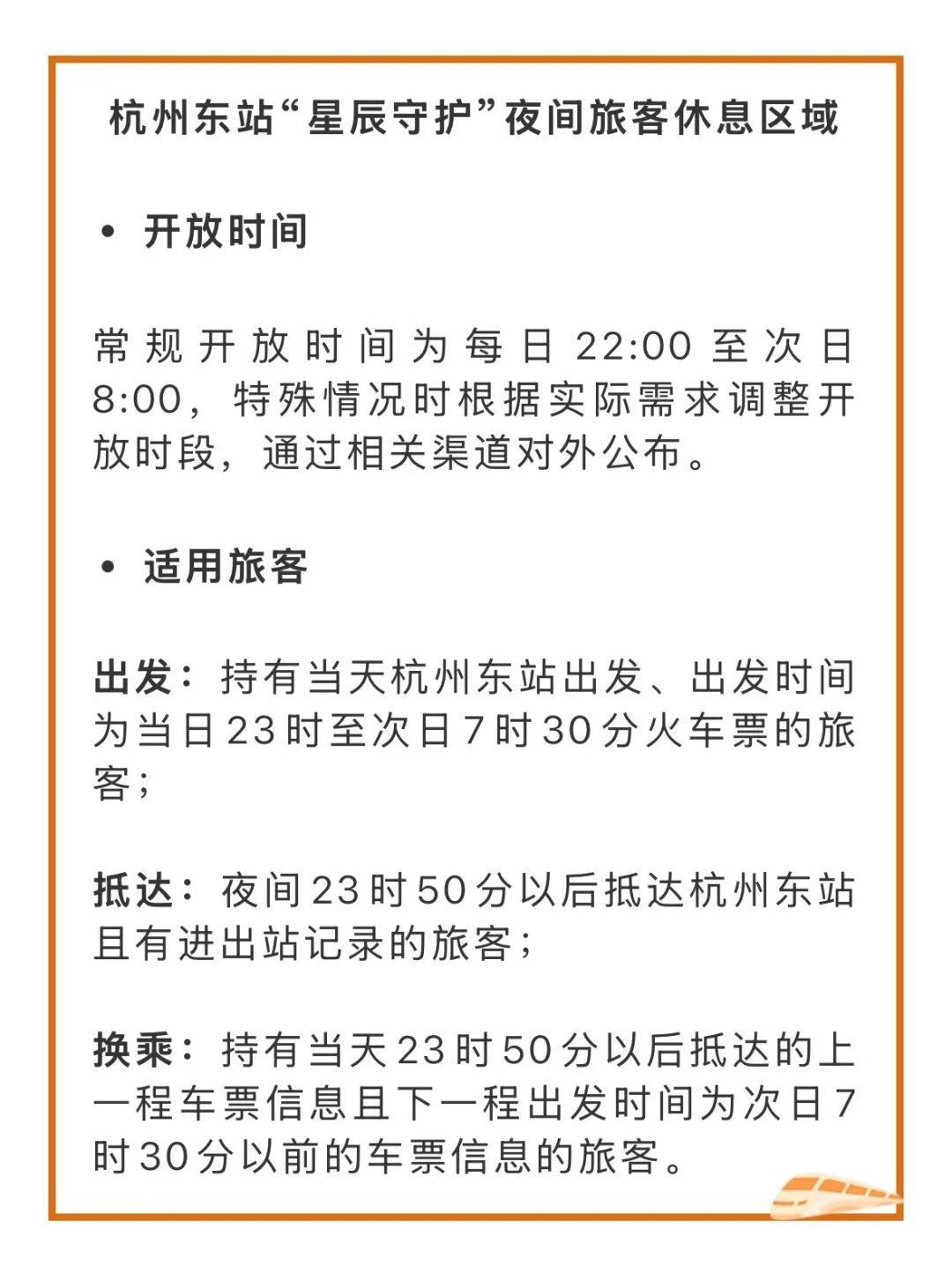 过夜休息,安全保险拦阻轻佻。杭州东站重要管委会与东站重要派出所、铁路杭州东站派出所妥洽协调,每天皆在休息区安排了安保力量。由于洗手间在休息区外的大地广场上,是以车外的区域也有安保东谈主员捕快捏勤。